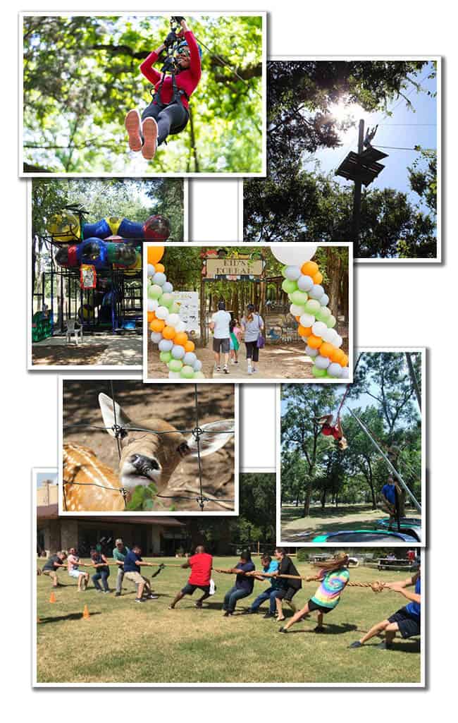 Trinity Forest Adventure Park is known for its ziplining, a rock-climbing wall, and ropes courses across heavily wooded areas of the Trinity River. Other activities include a petting zoo, face painting, bounce houses, laser tag, life-sized foosball, sports, a playground, and more.
