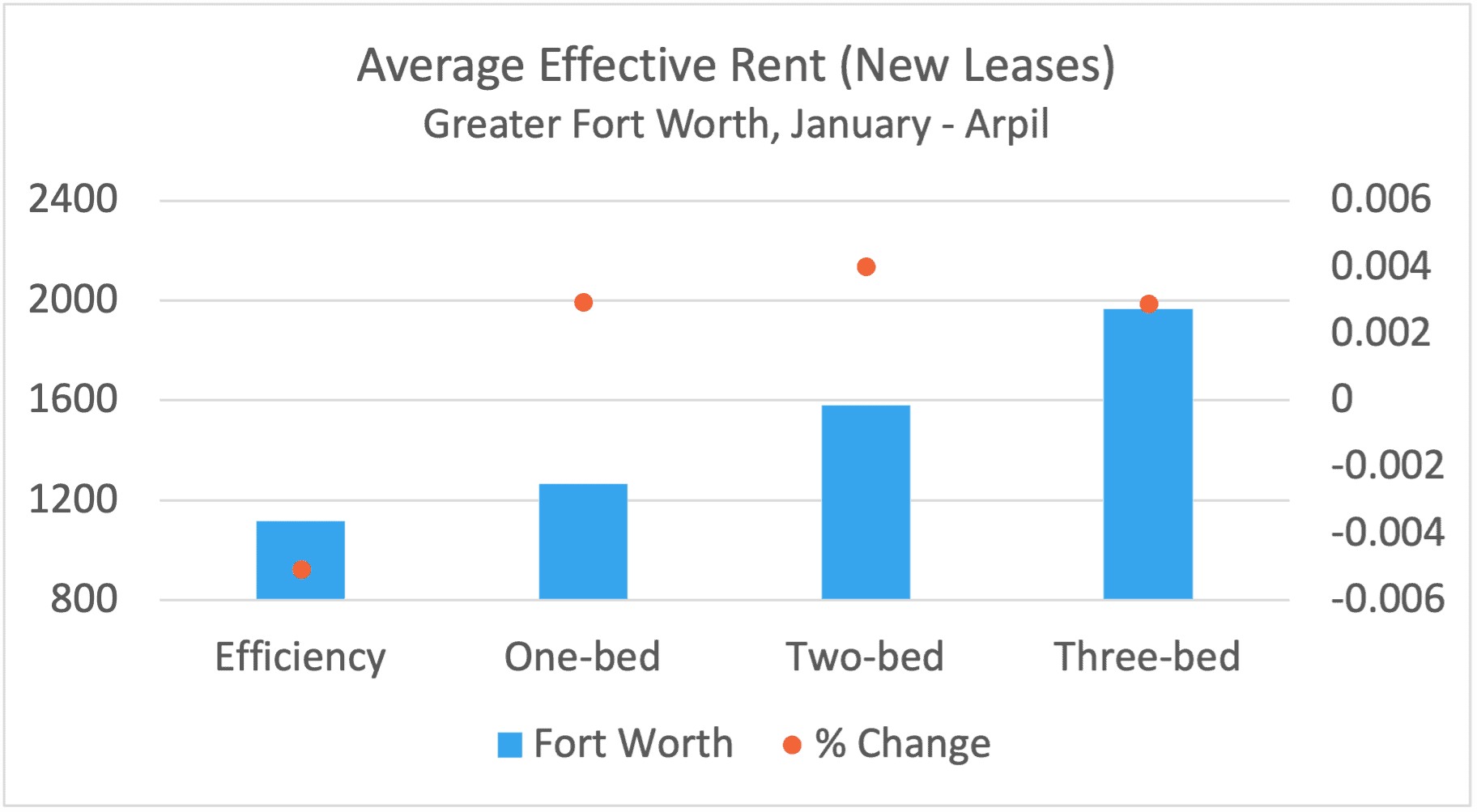 A 0.3% average effective rent increase through April for one-bedroom units across Greater Fort Worth was typical for the market to start the year outside of the efficiencies. The average one-bedroom unit closed April leasing for $1,265 per month after crossing $1,000 for the first time in the opening months of 2021.