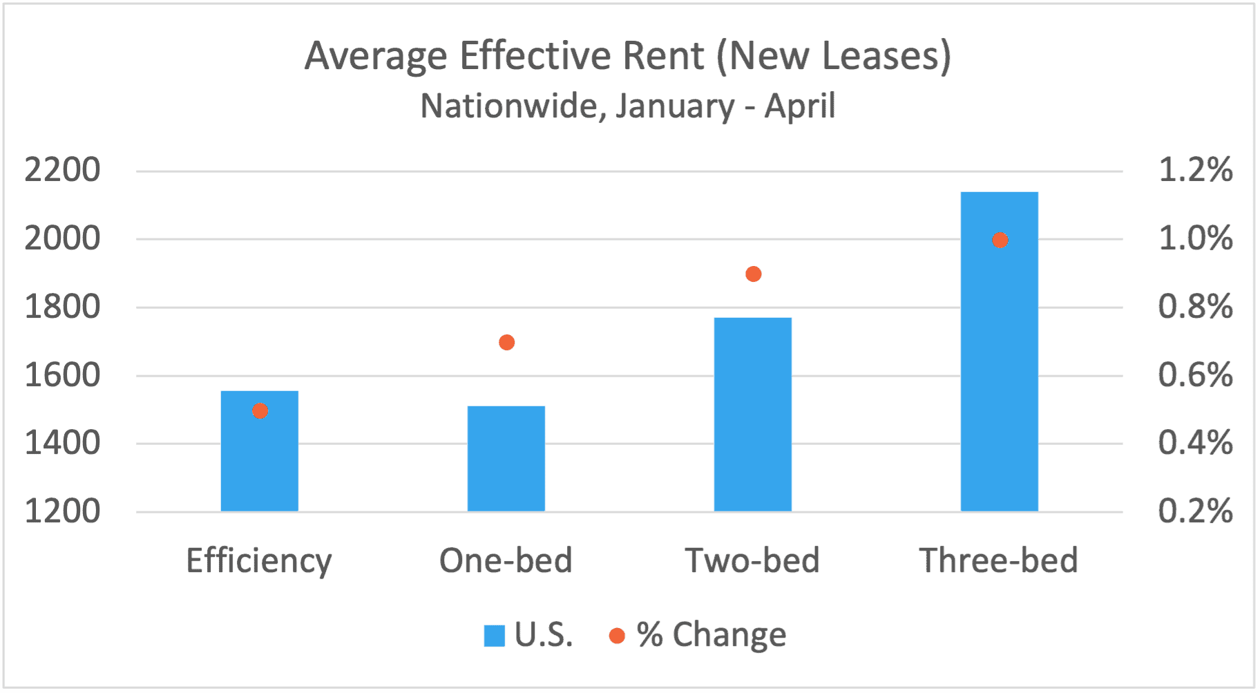 Two-bedroom units have performed very similarly to the one-bedrooms to start the year. An average effective rent gain of 0.4% was slightly better but was even more muted in relation to previous years than was the case for the gain for one-bedrooms. The average unit ended April leasing for $1,582 per month after an increase in the period of less than $10.