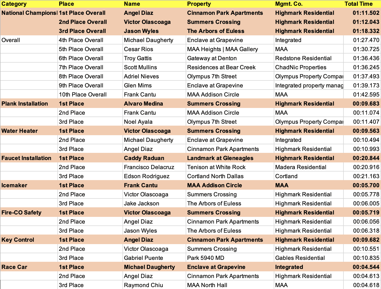 Once again, we held a fabulous Maintenance Mania event! Thank you to everyone who showed to both compete and cheer on your teams. Highmark Residential took top prizes by winning 5 of the 7 events. Kudos goes out to MAA and Integrated for rounding it out. Highmark Residential also took home the coveted Spirit Award by cheering on their teams in a spectacular way!