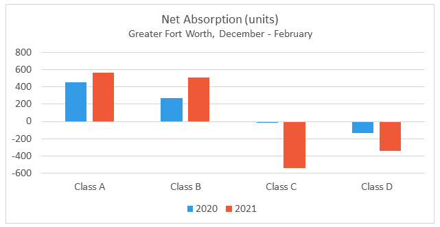 Class B properties also managed an increase in net absorption compared to a year ago, and to an even greater extent than Class A properties. Undoubtedly an average effective rent of $160 per month less than the Class A average was helpful in that regard. Net absorption of a little more than 500 units from December through February was almost double that of the previous year when just over 250 previously unoccupied units were leased during that same period.