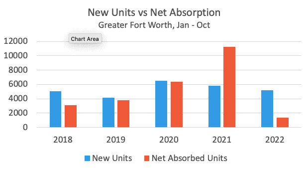 About 5,200 new units have been delivered across Greater Fort Worth through October of this year. This volume of new supply represented a decline from both 2020 and 2021 but was only marginally below the three-year average of 5,500 new units established during the same portion of the calendar from 2019 through 2021.