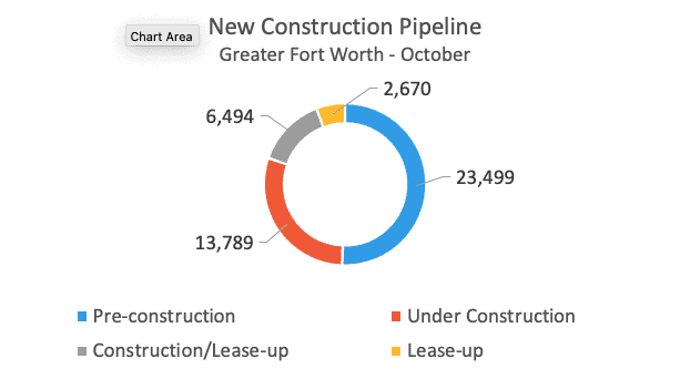 The top three submarkets for this phase of the pipeline are the same as from the last phase: North Fort Worth, South Fort Worth, and Denton – Corinth. Almost 60% of pre-construction units are located in just these three submarkets with the 5,400 units for North Fort Worth leading the way. One area that has yet to be mentioned is the Grapevine – Roanoke – Keller submarket. That region had about 1,200 units in the pre-construction phase of the pipeline to close in October.