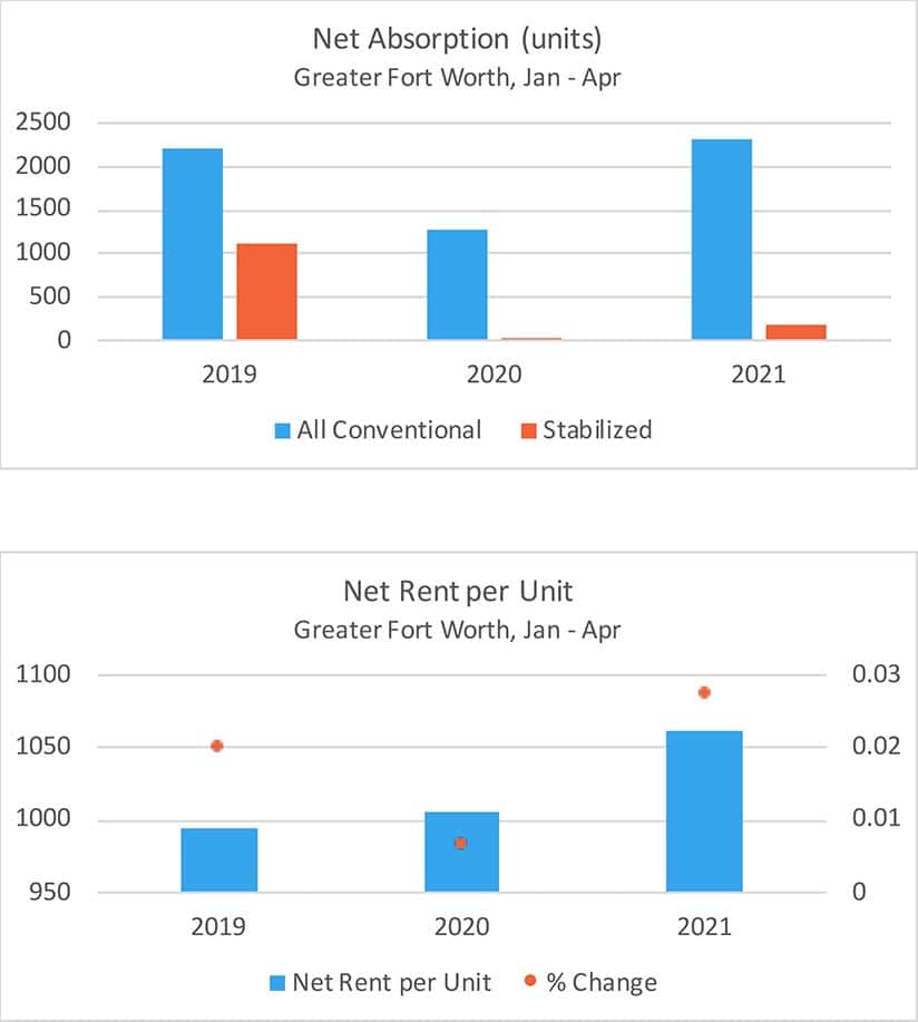 Net absorption totaled only about 200 units in the period This result compared very favorably to the less than 20 net absorbed units in the same portion of 2020 but fell well short of the more than 1,100 net absorbed units from January through April of 2019. Five of the 12 ALN submarkets for Greater Fort Worth experienced negative absorption to start the year. Demand was led by the Mid-Cities and Central Fort Worth portions of the market. Each added more than 100 net rented units. Stabilized demand was entirely in the Class A and Class B subsets with negative absorption in the lower two price tiers indicating the potential of continued household consolidation within that resident pool.