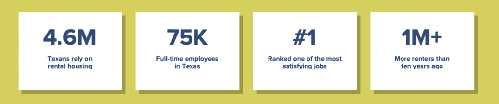 Multifamily—An industry that focuses on providing apartments and rental homes to the local population. By providing access to over 250,000 homes in Tarrant and eight other counties, the opportunities are boundless. Job types consist of apartment leasing, maintenance, administrative and accounting, training, management, and executive. Many resident-facing positions are attainable through training and advancement, even if you don’t have a college degree.