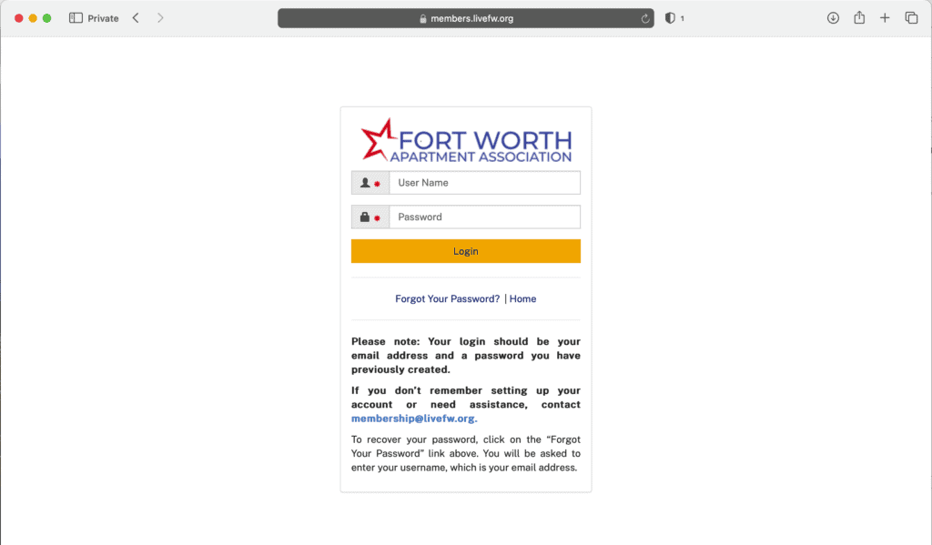 Enter your username and password. Your username will be your email address and you should have already established a password. If you need help resetting your password, please email membership@livefw.org and we can reset it for you: